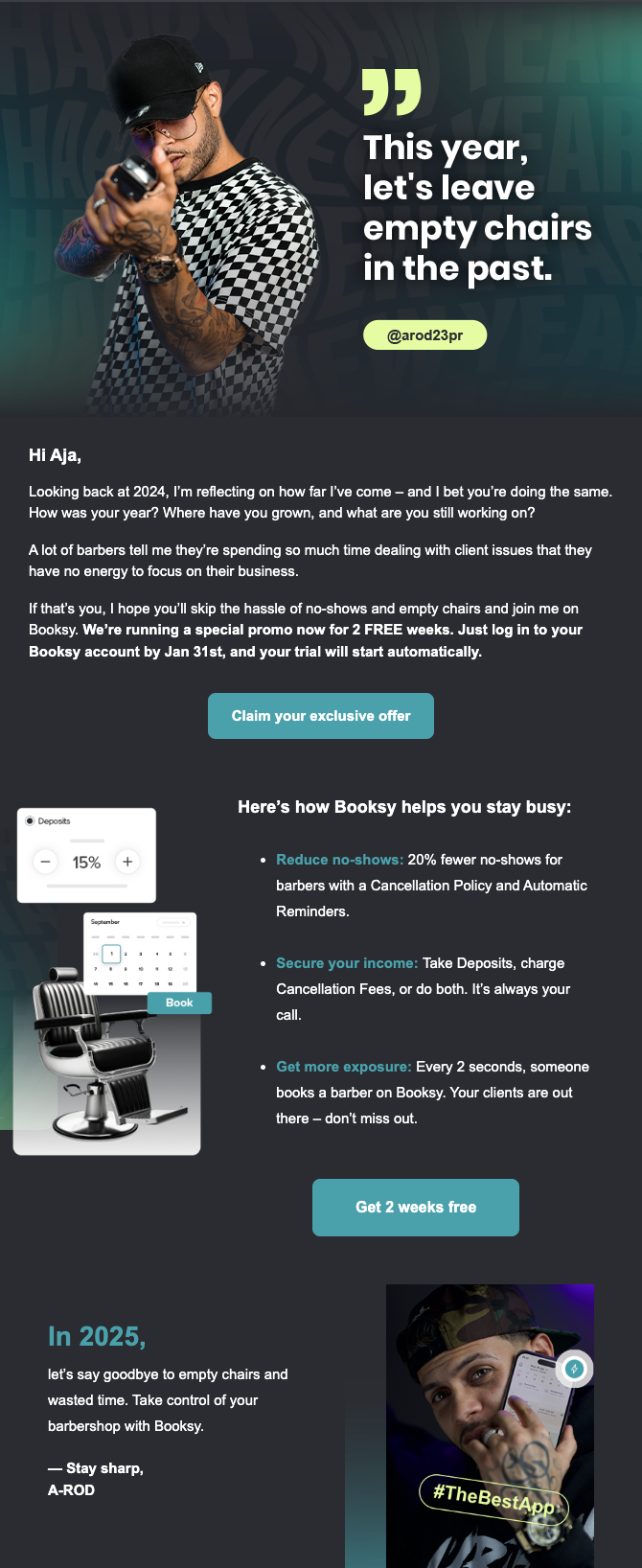 CHALLENGE: New Year’s is a time when business owners are open to fresh starts. Booksy wanted to leverage the season to motivate lapsed users to try the platform again. A tough segment to activate, with little time.