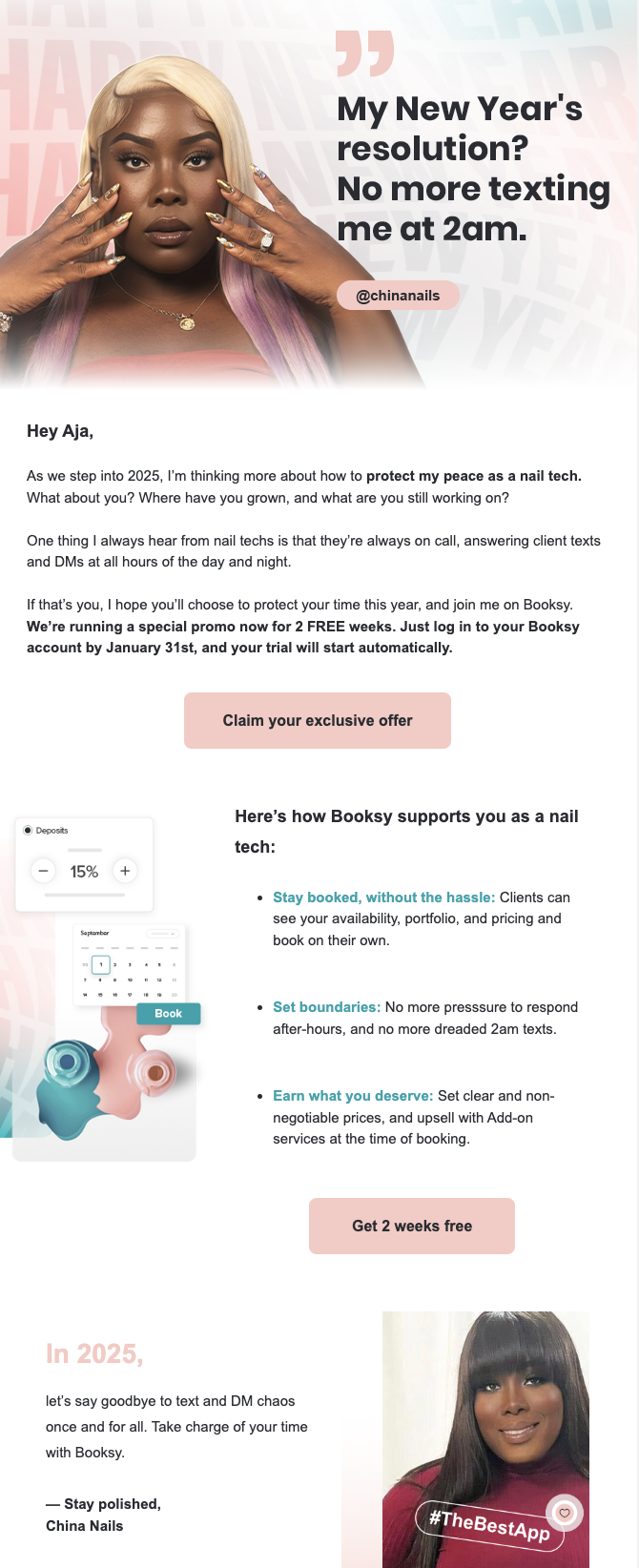 - Speak their language. Speaking to the challenges of each category, I developed open-worthy hooks and subject lines: Texting clients back and forth? So last year 💅